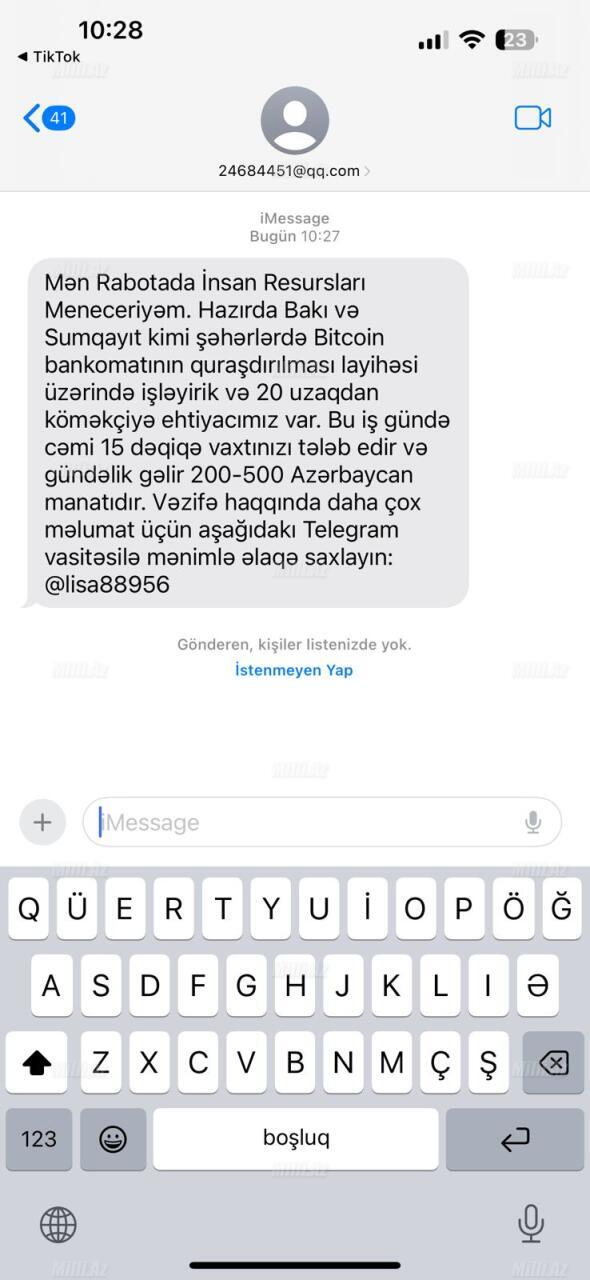 Milli.Az-ın məlumatına görə, mesajlarda özünü insan resursları meneceri kimi təqdim edən şəxslər Bakıda və Sumqayıtda guya bitcoin bankomatlarının quraşdırılması layihəsi üzrə uzaqdan iş təklif etdiklərini iddia edirlər.