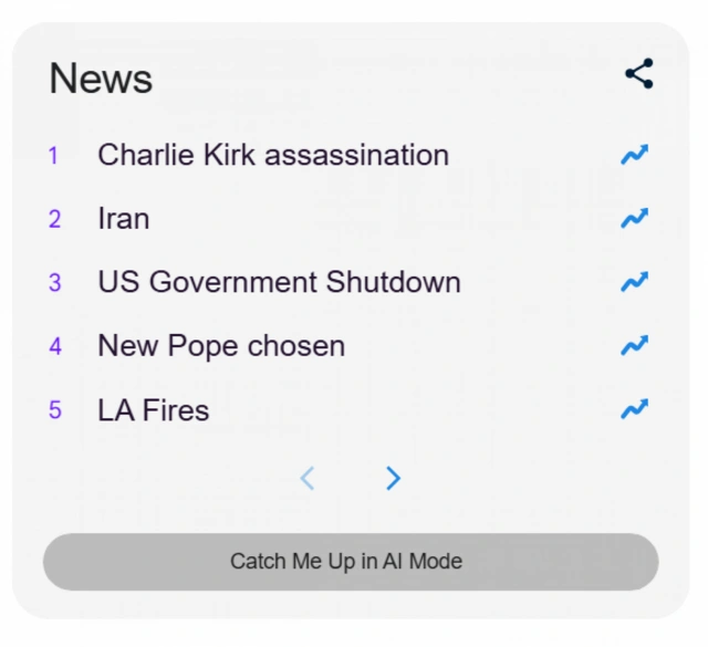2025-ci ildə xəbərlər arasında daha çox diqqət çəkən mövzular isə Çarli Kirkin qətli, İrandakı hadisələr və ABŞ hökumətinin işinin dayandırılması olub. Ən populyar üç şəxs isə D4vd, Kendrik Lamar və Cimmi Kimmel olaraq qeydə alınıb.