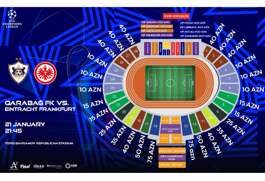 The price of tickets for fans who want to buy tickets for the VVIP C and VVIP D sectors and enjoy VIP Lounge privileges is 200, 250, 300, 400, and 1000 manats.