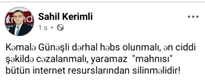 O, paylaşımında Kəmalə Günəşli barədə çox sərt fikirlər səsləndirib.
