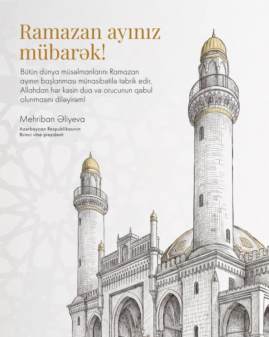 "Bütün dünya müsəlmanlarını Ramazan ayının başlanması münasibətilə təbrik edir, Allahdan hər kəsin dua və orucunun qəbul olunmasını diləyirəm!".