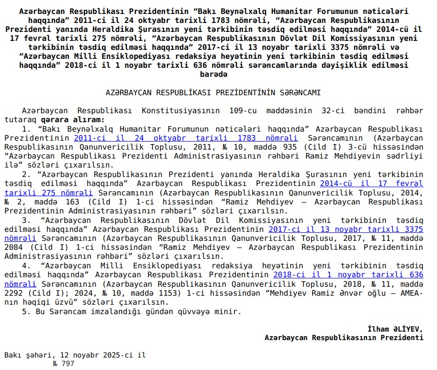 Prezident İlham Əliyevin noyabrın 12-də sərəncam imzalayaraq Ramiz Mehdiyevi bu vəzifələrdən azad etdiyi haqda xəbər mediada yayılsa da, sənədin mətni xəbər yayılan günlərdə hələ dərc olunmamışdı.