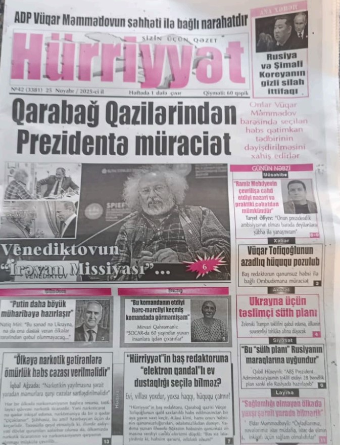 Главный редактор газеты «Хюррийет», её онлайн-версии и «Hurriyyet TV» Вугар Мамедов (Тофиоглу) находится в заключении с 29 октября 2025 года. Он был задержан в ходе операции, проведённой Службой государственной безопасности (СТБ), 31 октября по представлению Генеральной прокуратуры и решению суда Сабаильского района в отношении В.Мамедова была избрана мера пресечения в виде ареста сроком на 3 месяца и 13 дней.
