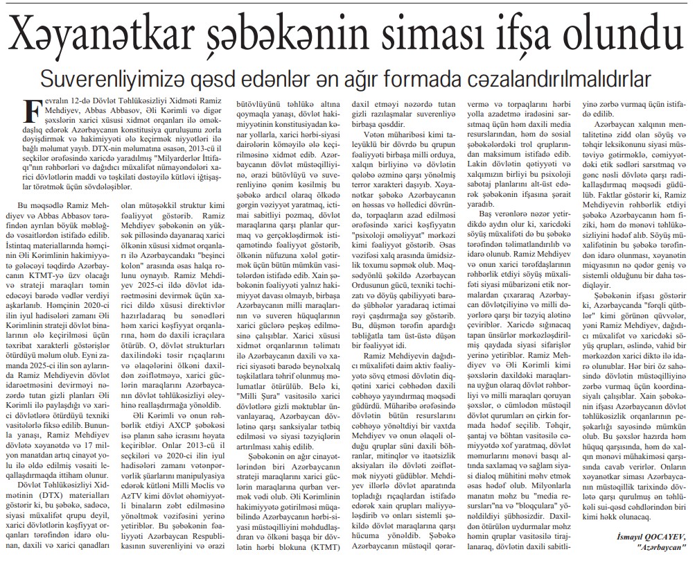 Fevralın 13-də “Azərbaycan” qəzetində dərc olunmuş “Xəyanətkar şəbəkənin siması ifşa olundu. Suverenliyimizə qəsd edənlər ən ağır formada cəzalandırılmalıdırlar” başlıqlı yazıda deyilir: “Dövlət Təhlükəsizliyi Xidməti Ramiz Mehdiyev, Abbas Abbasov, Əli Kərimli və digər şəxslərin xarici xüsusi xidmət orqanları ilə əməkdaşlıq edərək Azərbaycanın konstitusiya quruluşunu zorla dəyişdirmək və hakimiyyəti ələ keçirmək niyyətləri ilə bağlı məlumat yayıb. DTX-nin məlumatına əsasən, 2013-cü il seçkilər ərəfəsində xaricdə yaradılmış "Milyarderlər İttifaqı"nın rəhbərləri və dağıdıcı müxalifət nümayəndələri xarici dövlətlərin maddi və təşkilati dəstəyilə kütləvi iğtişaşlar törətmək üçün sövdələşiblər.