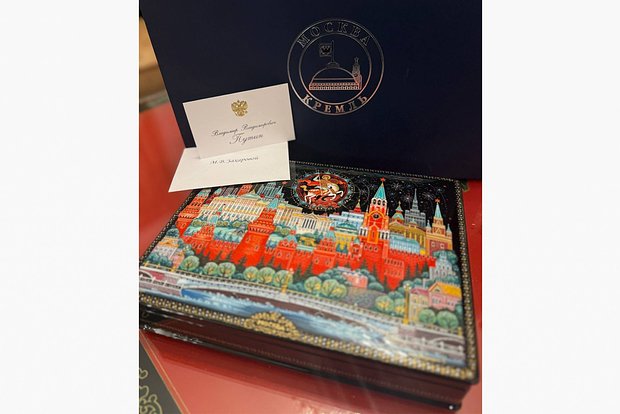 Hədiyyənin yanında "Vladimir Vladimiroviç Putin" imzalı açıqca və ehtimal ki, "M.V. Zaxarova"ya ünvanlanmış zərf var.